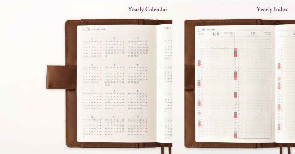 A convenient double-page spread shows the yearly calendars for 2016 and 2017 at one glance as a useful reference when planning ahead. Days are neatly fitted into one square each.
