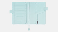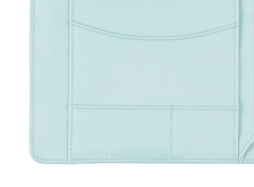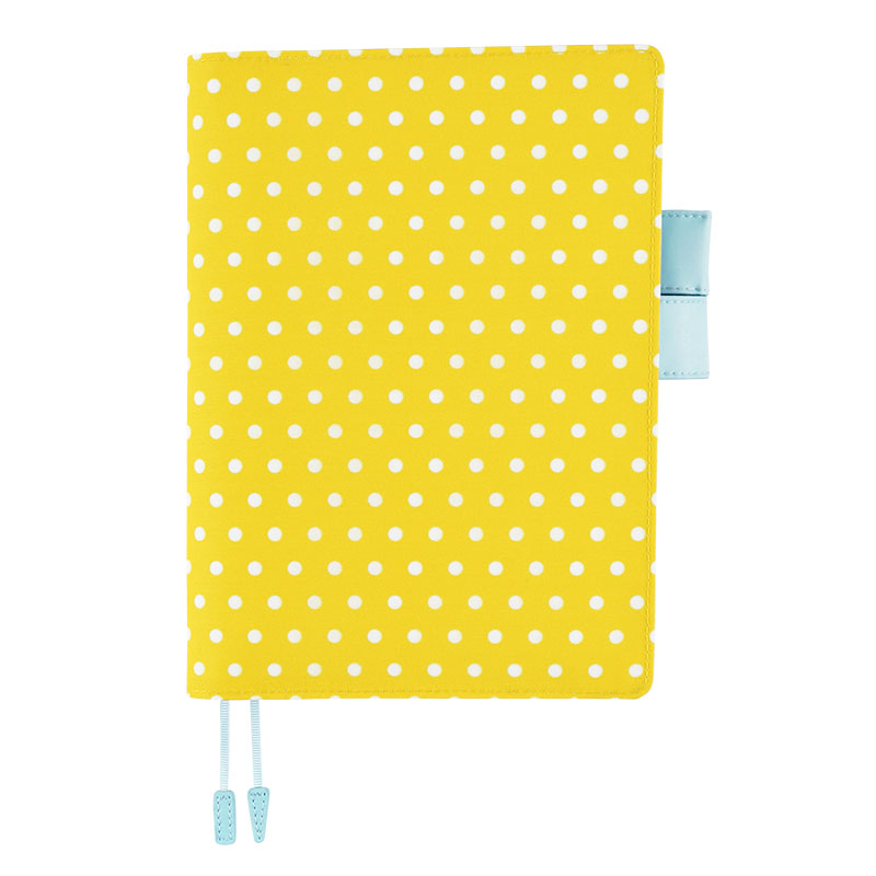 This design features vibrant yellow material overlayed with a white polka-dot pattern. Between the bright exterior and pleasant light blue of the cover interior and pen holder, the cover is reminiscent of a refreshing, juicy citrus fruit. This cheerful cover is sure to invigorate its user so they can face the day’s challenges together.