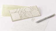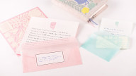 The writing area of the paper includes a flower and ruled lines for writing messages. The border features large flowers Kagoshima drew all the way to the edges of the paper. The envelopes included with the letter set are semi-transparent so you can see the letter paper’s design through the envelope.