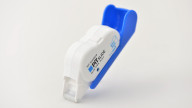 The white body slides into the blue tray to conceal the tape while carrying it around, and slides back open during use.