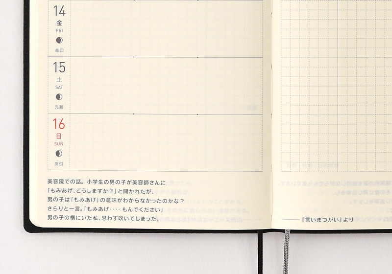 WeeksA Japanese planner with a week per page format and plenty of blank graph paper.