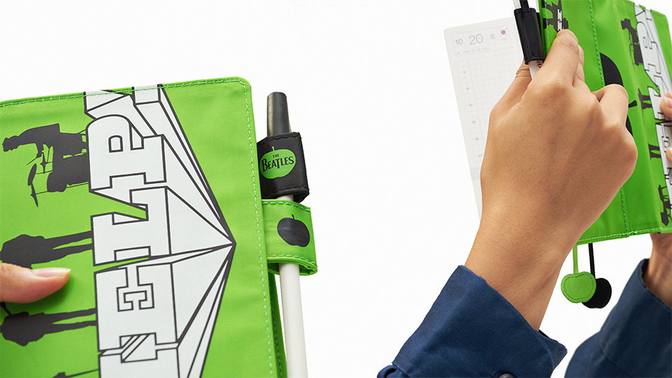 The apple and the Beatles logo printed on each pen holder match up when closed.