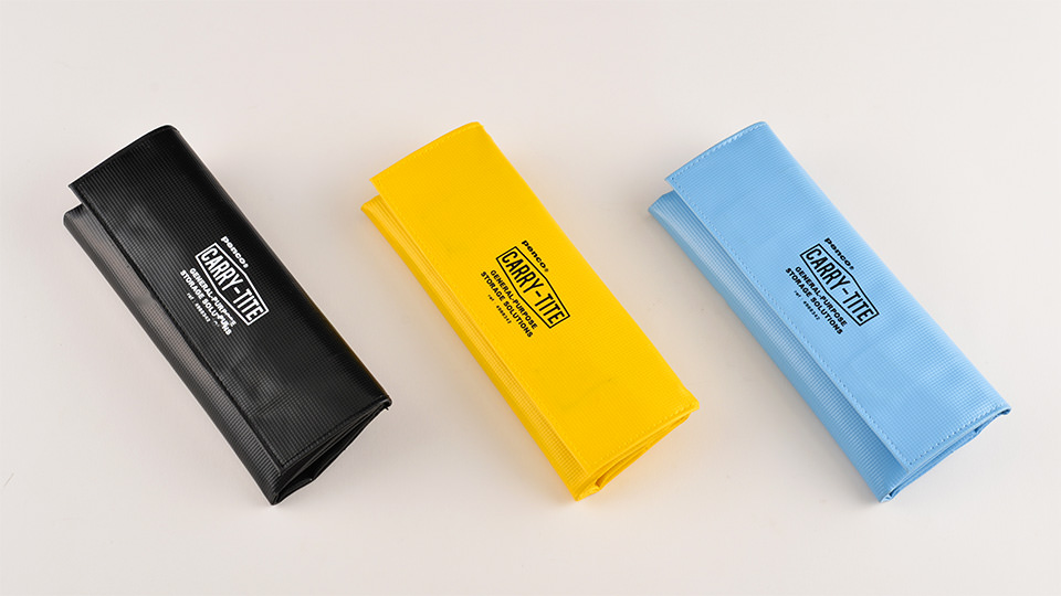 This light yet durable carrying case provides a convenient place to store writing tools and other stationery. The hook-and-loop fastener makes it easy to open and close, and fashions it into either a tri-fold pen case or a bi-fold storage pouch.