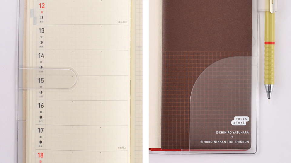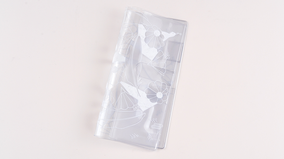 This is the decorated version of the Weeks Clear Cover, a protective, clear plastic covering that goes over your Hobonichi Techo Weeks. It protects your planner from wear and tear over the course of the year, and provides a sideways bookmark, a place to store your pen, and two card-size pockets.