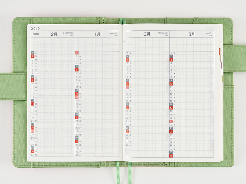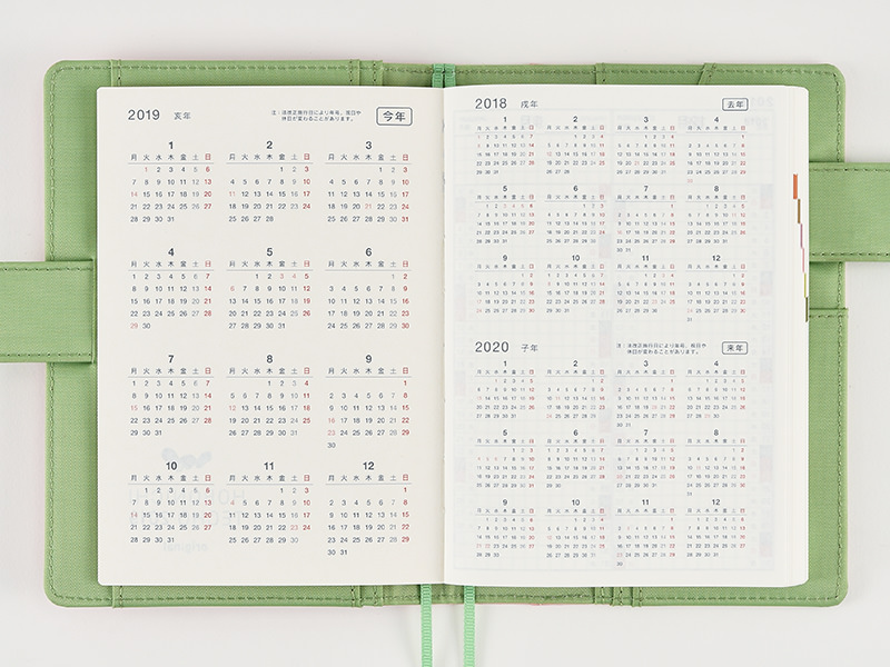 With 2 months per page, there are 8 pages covering the 16 months from February 2018 to May 2019. The top of each monthly column includes 4 lines of space for recording things like that month’s goals or commitments, or drawing in checkboxes for a to-do list.