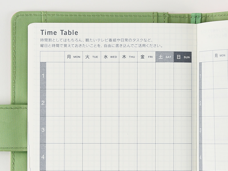The book includes two timetables for writing in a recurring hourly schedule for each day of the week. These are useful, say, for filling in the broadcast times of favorite television shows, or splitting up house chores.