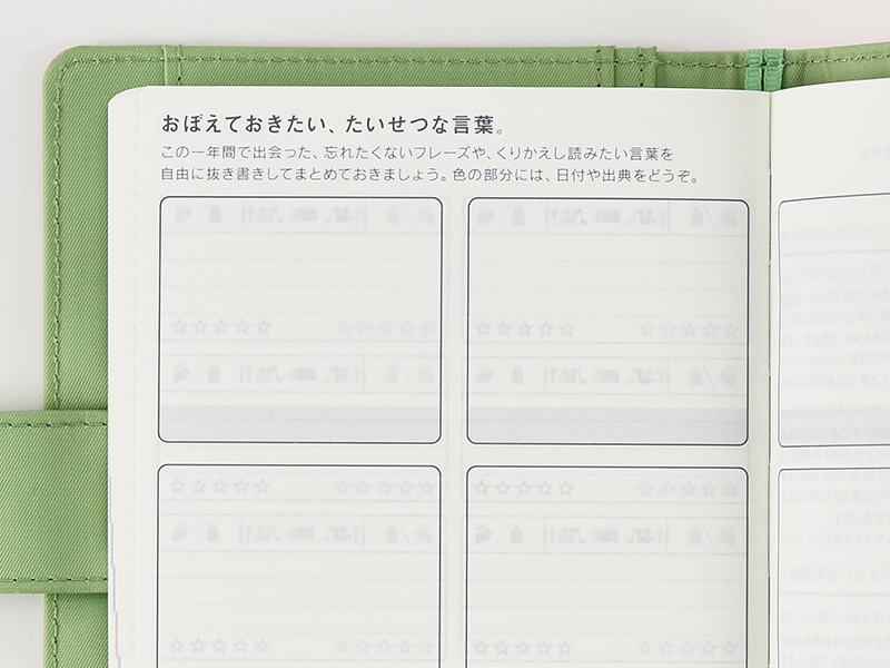 This page contains space to record memorable phrases you don’t want to forget. There’s also a lightly printed area for adding a date or citing a source. You can also tape in small photographs to create an album of sorts.