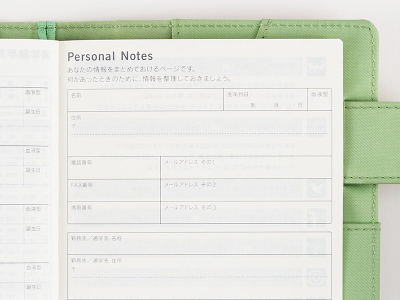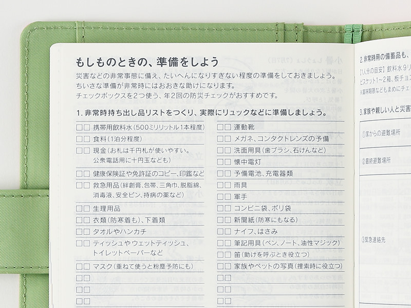 This page contains a checklist of items to have ready in case of an emergency. There is also a space to list nearby evacuation zones (common in Japan), emergency contact information and topics discussed between family and friends.