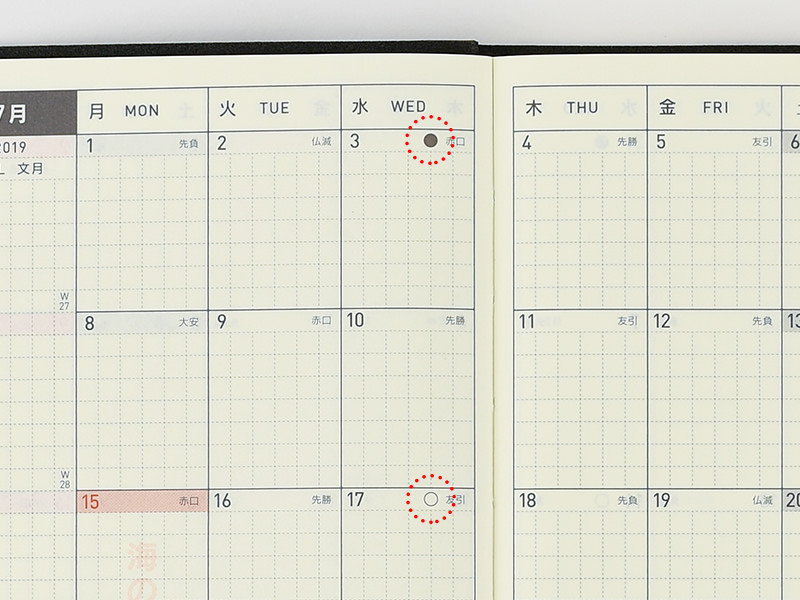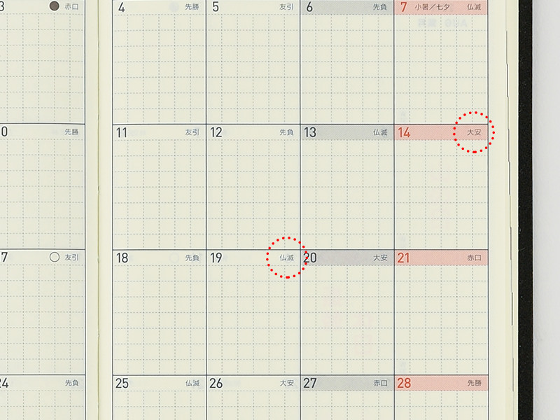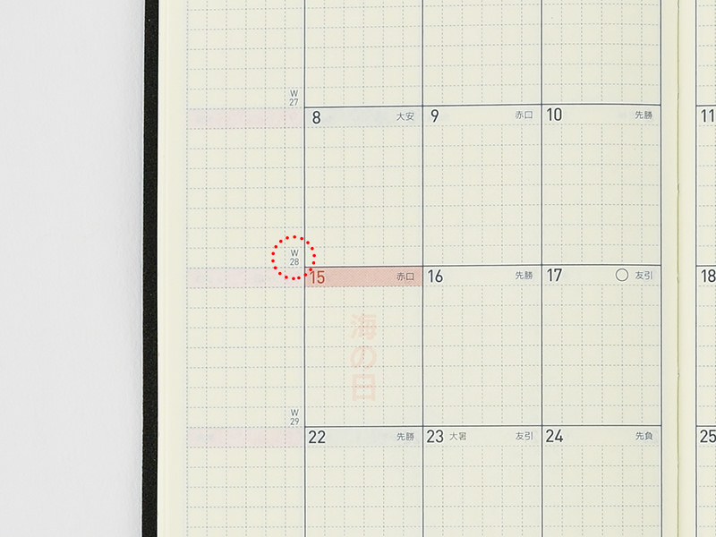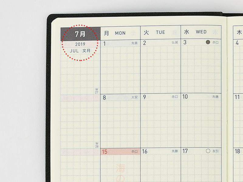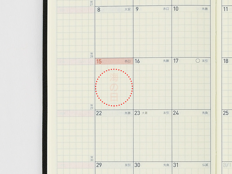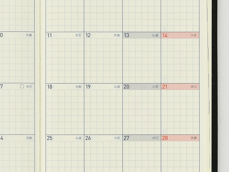 The monthly calendar is ideal for managing schedules. The graph paper design is lightly printed to make it easier to write in your plans and take notes in an even line. The subdued gray and red allow for high visibility when writing in the calendar.