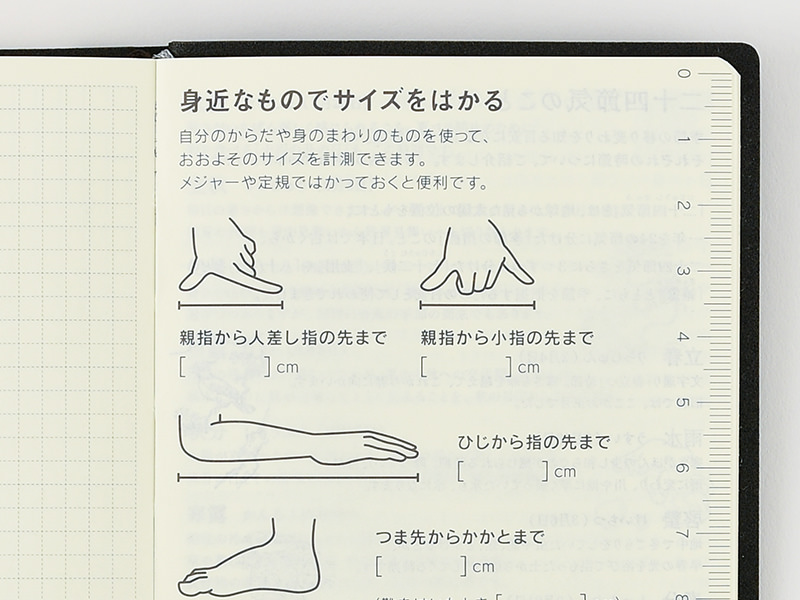 This page is useful for measuring short sizes when you’re out and about. The edge of the page is printed with an 18 cm ruler.