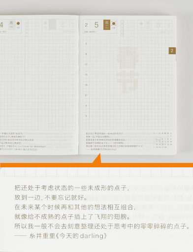 After running surveys and holding round-table discussions with users, the graph paper size was finalized at 3.7 mm. Users of the Cousin, now in its second year, told us they missed the daily quotes, so we offered a separate book that collected all of them.