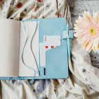 The pen holders act as a hinge that keeps the cover safely shut when storing a pen in both of the holders. The cover contains two bookmarks, one with a rectangle charm and one with a triangle charm, so you can keep your place in two parts of the book, such as the monthly calendar and the daily page.