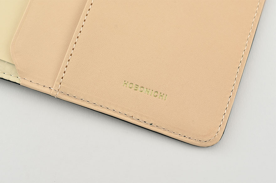 The cover interior contains natural leather that transforms and deepens in personality over time. The lower right card pocket is foil-pressed with the Hobonichi logo.