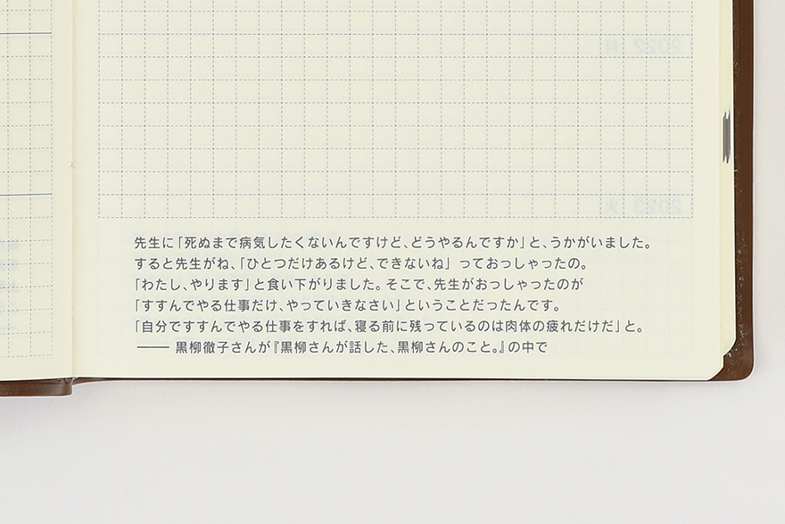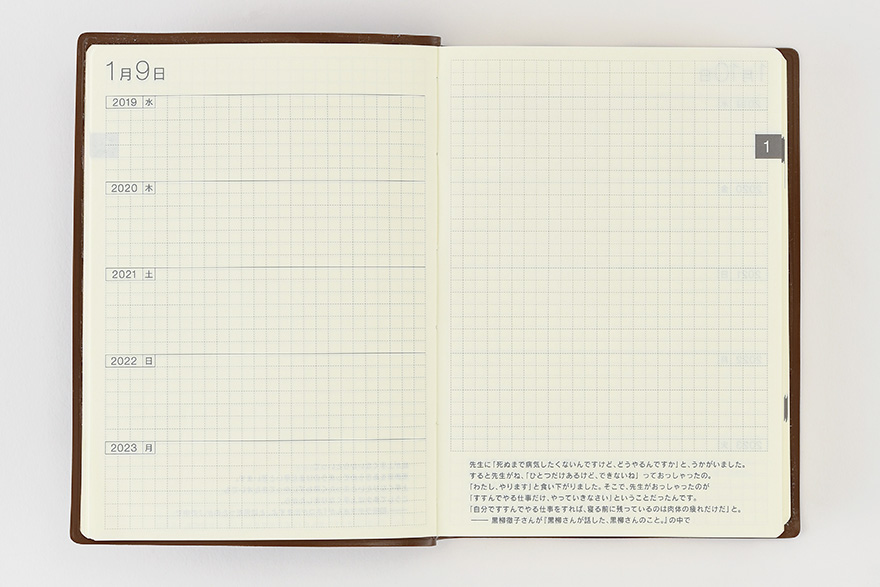 The right page is a blank page for anything you’d like — continuing entries you couldn’t fit on the left, jotting notes you’d like to leave for the future, pasting items, and more. The Japanese daily quotes on the bottom of the page are excerpts from Hobo Nikkan Itoi Shinbun articles from the past 10 years.