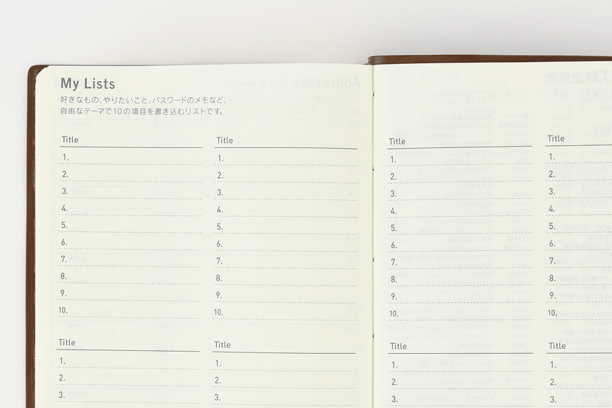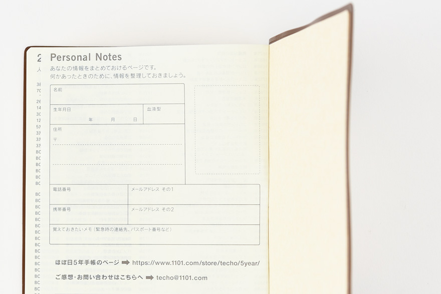 The start of the book contains a yearly calendar across the 5-year span. The back of the book contains useful pages such as “A Year Per Page” memo pages, “Gifts” for tracking gifts given and received, “Addresses” to list important contact information, “My Lists” for making a list of any theme of your choice, “Human History in 2 Pages” for informational reading material, and “Personal Notes” to record information about yourself. (These pages are in Japanese.)