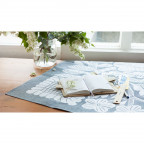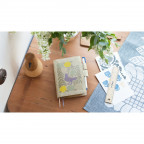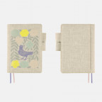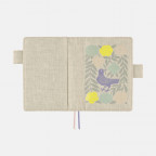 Kagoshima, who designed this silkscreen print over soft, high-quality linen, named the cover “Bird, Flower, Willow.” A variety of different flowers and a beautiful willow tree are drawn around a lavender-colored bird. You can see the cute bird happily preparing for its next move as it stands among colorful flora. The print is applied in a way that very slightly raises it from the surface, making it delightful to the touch, as well.