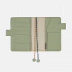 The gray-green faux leather interior and pen holders are accented with dotted lace bookmarks.