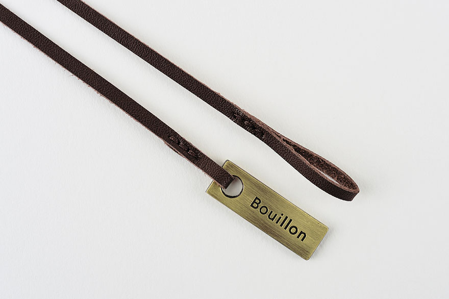 The bookmarks are designed to look like a leash and collar. One bookmark has a brass charm embossed with “bouillon,” while the other bookmark has a ring at the end like the handle of a leash.