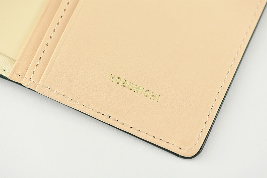 The cover interior contains natural leather that transforms and deepens in personality over time. The lower right card pocket is foil-pressed in gold with the Hobonichi logo.