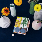 The A6 “spring mix” cover is a patchwork design that brings yellow, blue, green, and other color schemes of 9 different textiles together. The textiles have a variety of textures to them and contain natural elements in the designs, such as flowers, trees, birds, and butterflies.