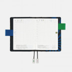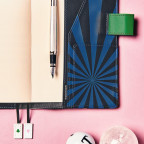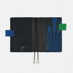 Pen holders are green and blue. The interior of the cover is dark gray with eye-catching blue patterns accenting the Ticket Pocket.