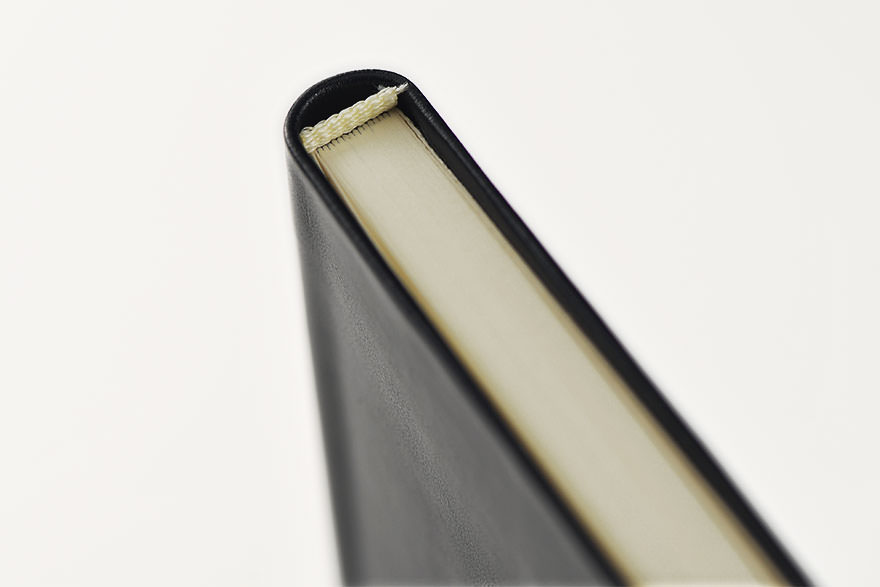 The cover has been constructed as a light, hardcover book with some give to it so it still bends. The top and bottom of the book spine contain headbands to reinforce the binding and decoration. Midnight is tastefully coordinated with an ivory headband to contrast the navy color scheme.