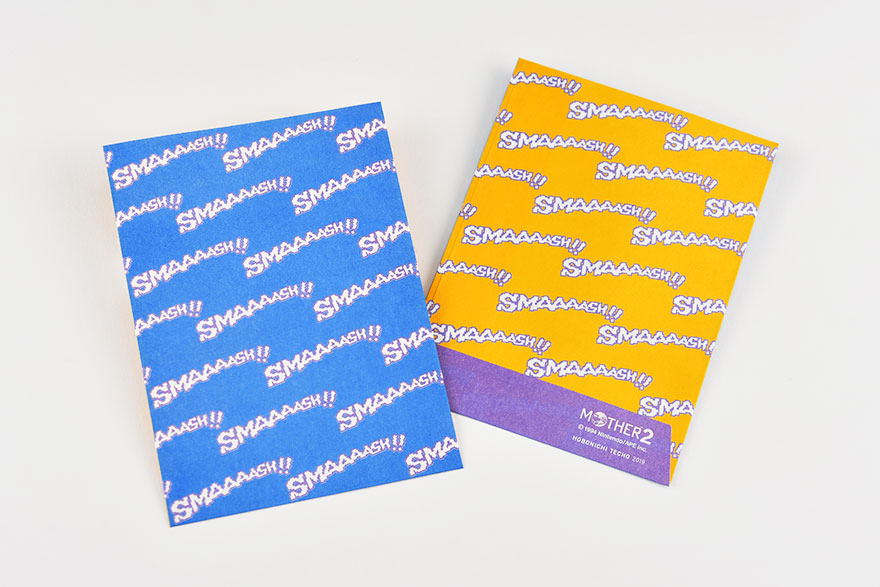 Along with the other Mother 2 covers in the 2019 series, Drink coffee before go? comes with a mini envelope. When fighting enemies in the game, your character will occasionally strike a critical hit, and the word “SMAAAASH!!” appears on the screen. The iconic graphic is printed on these small envelopes, with blue on the front and yellow on the back. We hope you can find a use for these in a special situation!