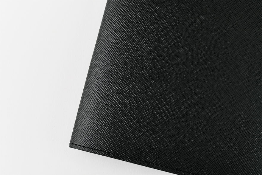 The classic black color scheme is consistent throughout the cover to give it a sophisticated look. The base of the interior is smooth leather, while the pockets contain the same texture as the exterior.