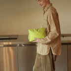 This pouch is dotted with Suki-Usagi, a popular character created by manga artist, illustrator, and animator Q-rais. The material uses the same textured, shiny fabric used in neckties, and Suki-Usagi is featured with a variety of charming expressions and poses. The background color is a vivid lime green.