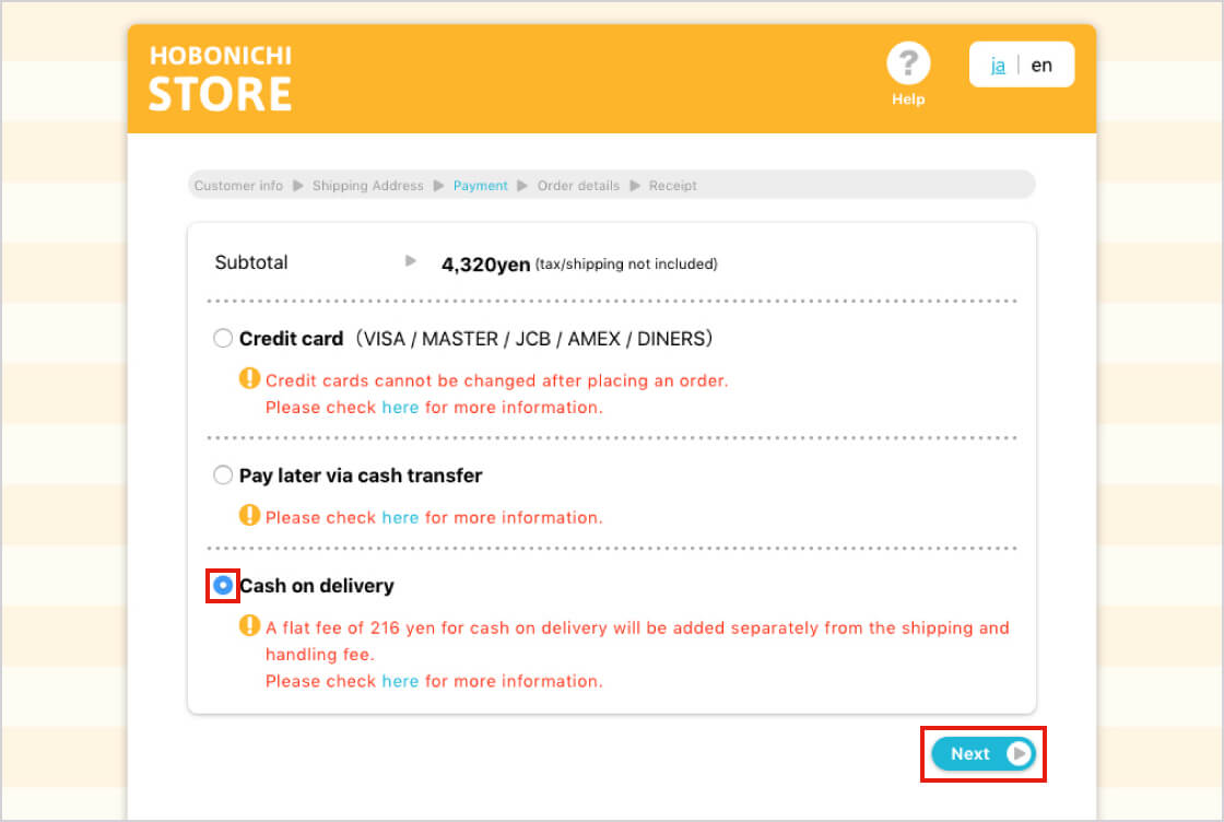 This payment method is only available for orders placed within Japan. An additional handling fee of 216 yen will be added to the order. Cash only.