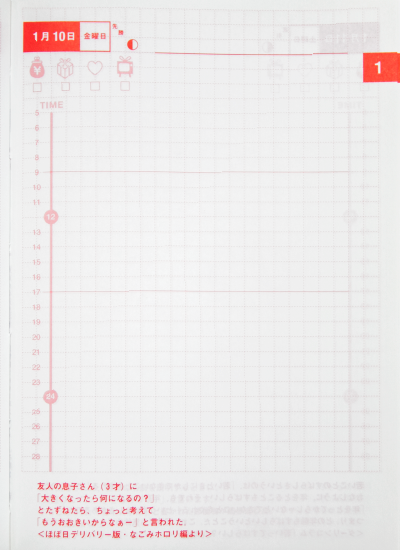 The techo’s daily pages were updated to include the “secret line,” a vertical dividing line that’s handy for those who’d like to use it, but is otherwise easy to ignore. The checkboxes were simplified, and this was also the first year that daily quotes were included for each of the book’s 365 days. These features are unique to Hobo Nikkan Itoi Shinbun’s special techo, and carry on every year.