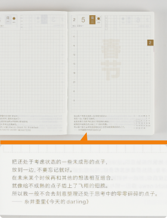 After running surveys and holding round-table discussions with users, the graph paper size was finalized at 3.7 mm. Users of the Cousin, now in its second year, told us they missed the daily quotes, so we offered a separate book that collected all of them.