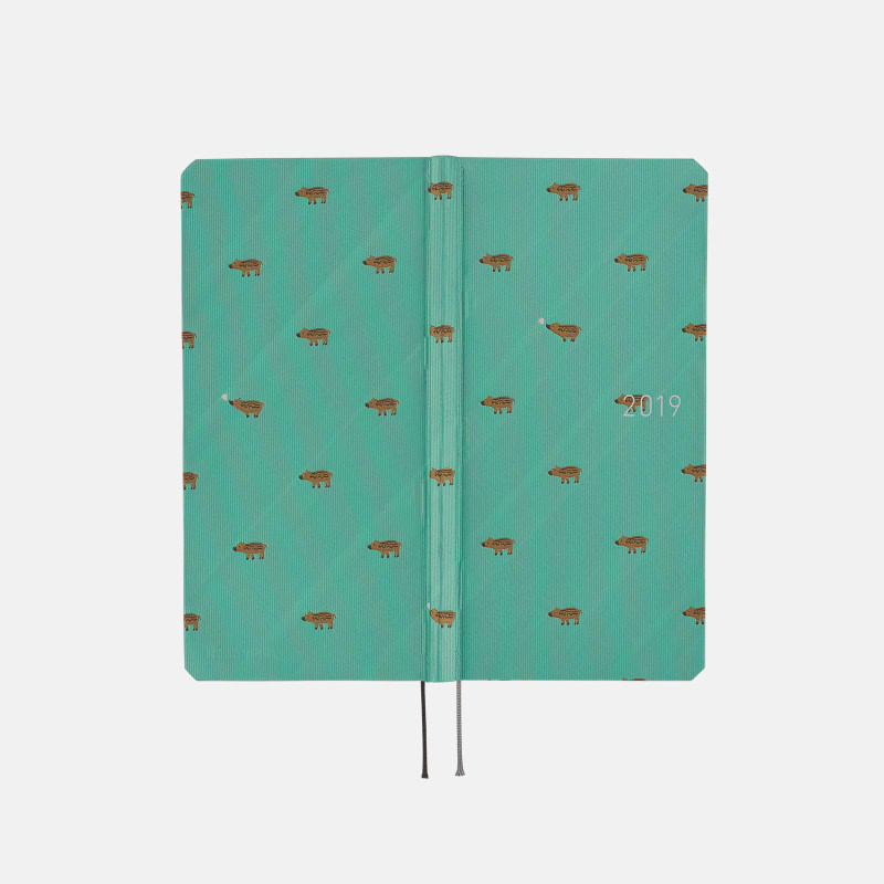 Boar piglets lined up along a refreshing mint blue background give the cover its unique look. Their cute, round little bodies and the stripes down their back are woven into the fabric, just like on a patterned necktie.