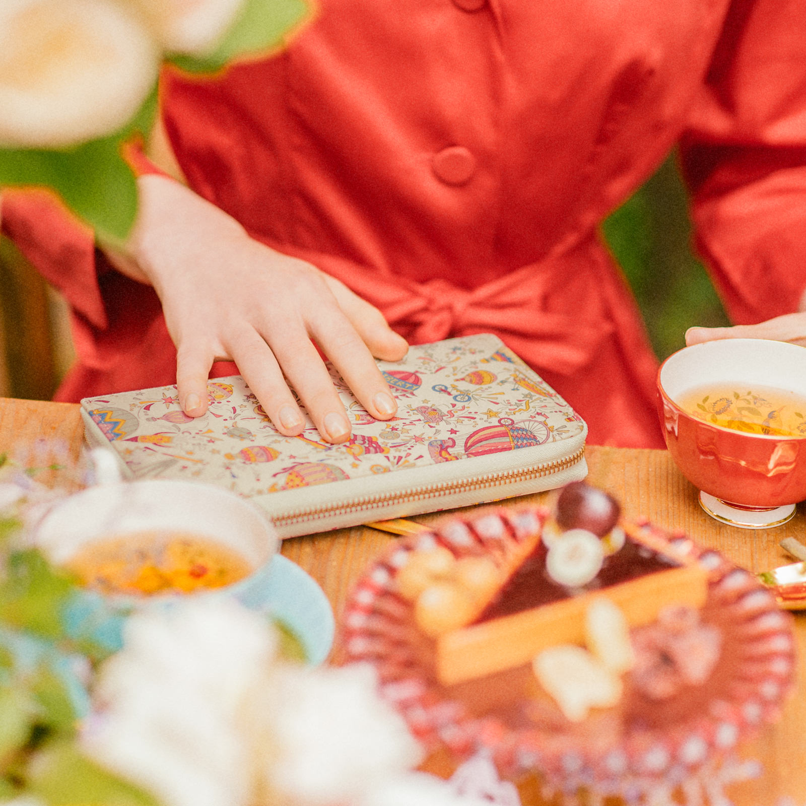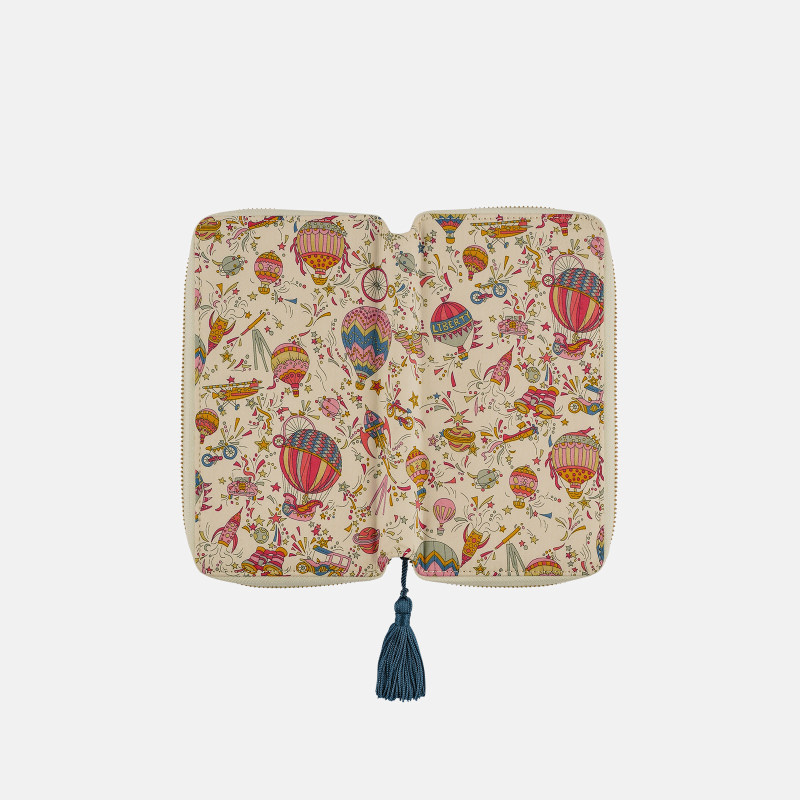 The pattern features an off-white fabric printed with illustrations reminiscent of pop art. There are hot air balloons, airplanes, and even rockets and satellites! Although the lively drawings have an energy to them, the cover’s classical color scheme keeps the art relaxing. The cover interior is made with beige leather.