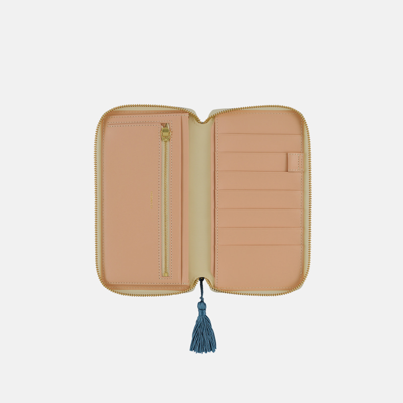 The zipper pull contains a blue-gray tassel that pulls its color from the illustrations.