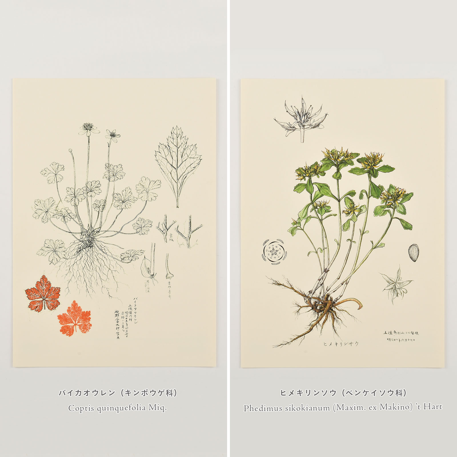 These plant illustrations were drawn by botanist Tomitaro Makino, known as the “Father of Japanese Botany”. We printed illustrations of plants that have a close relationship with Dr. Makino, in that he preferred, discovered, or gave the Japanese name of the plant. They are: Calypso bulbosa, Tricyrtis macrantha Maxim, Coptis quinquefolia Miq, and Phedimus sikokianum. Each diagram is drawn out with intense detail through careful observation.