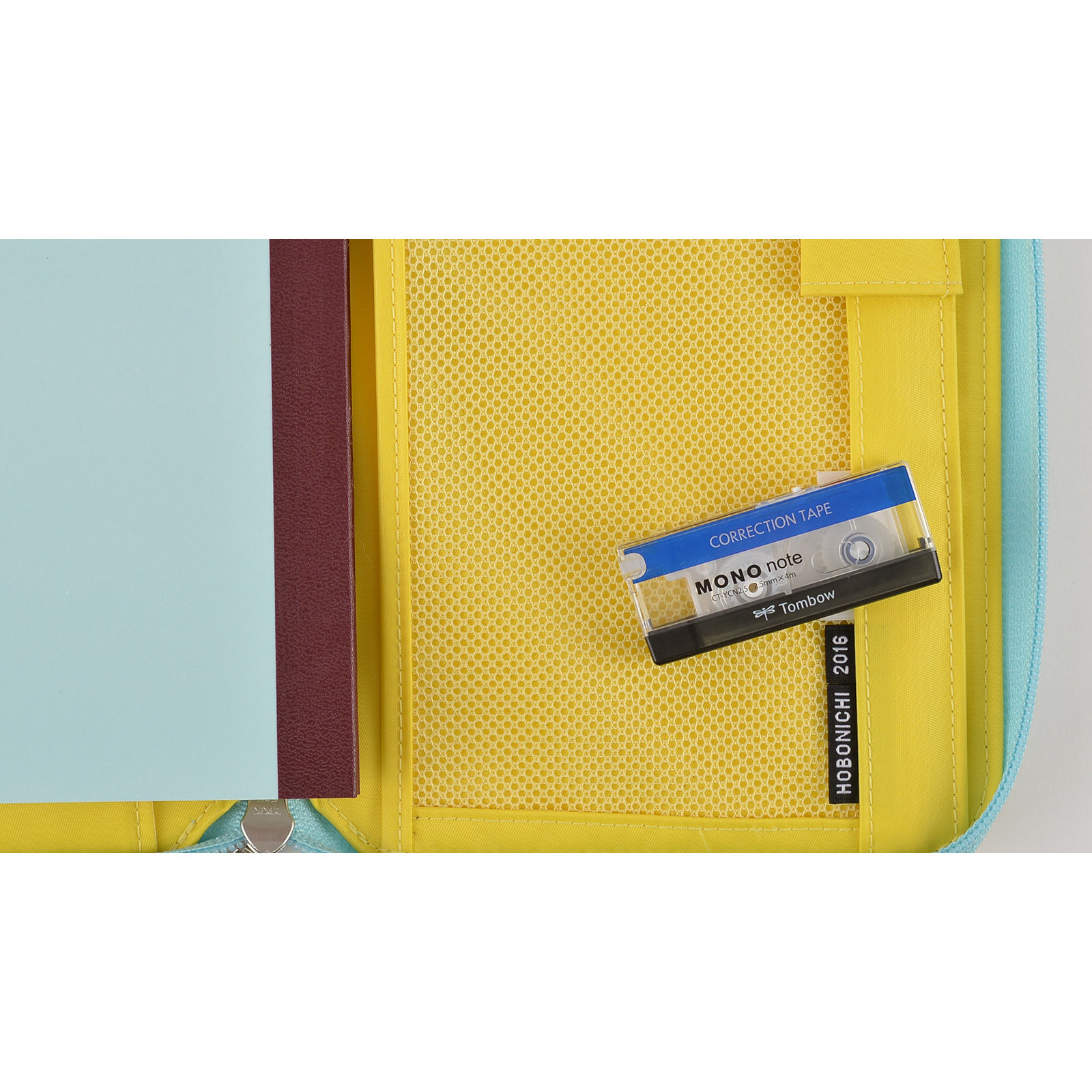 The 4.2 mm Mono PS is closer to a standard size and fits nicely along the rows of the Hobonichi Techo grid paper. The compact dispenser fits neatly into a pen case for easy portability.