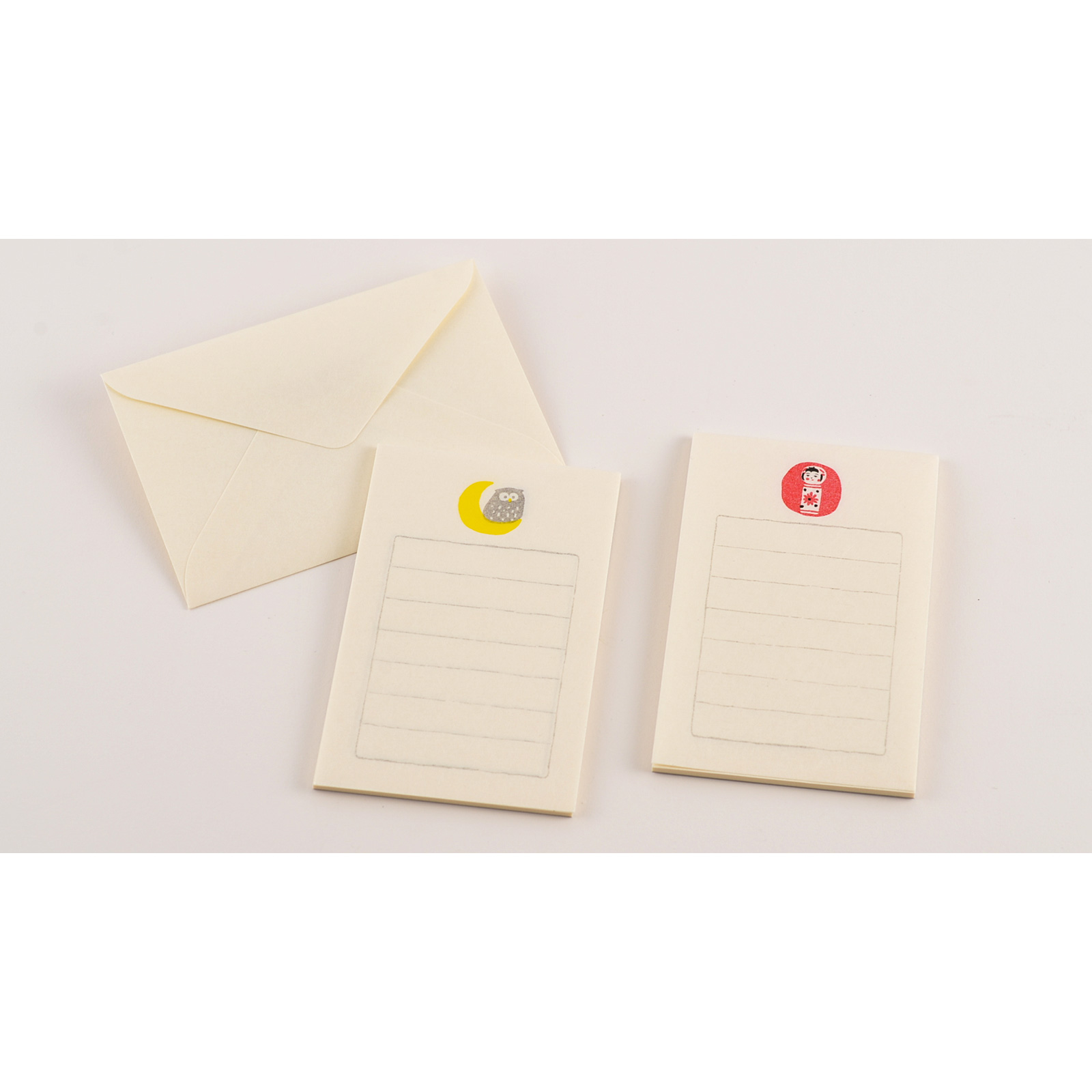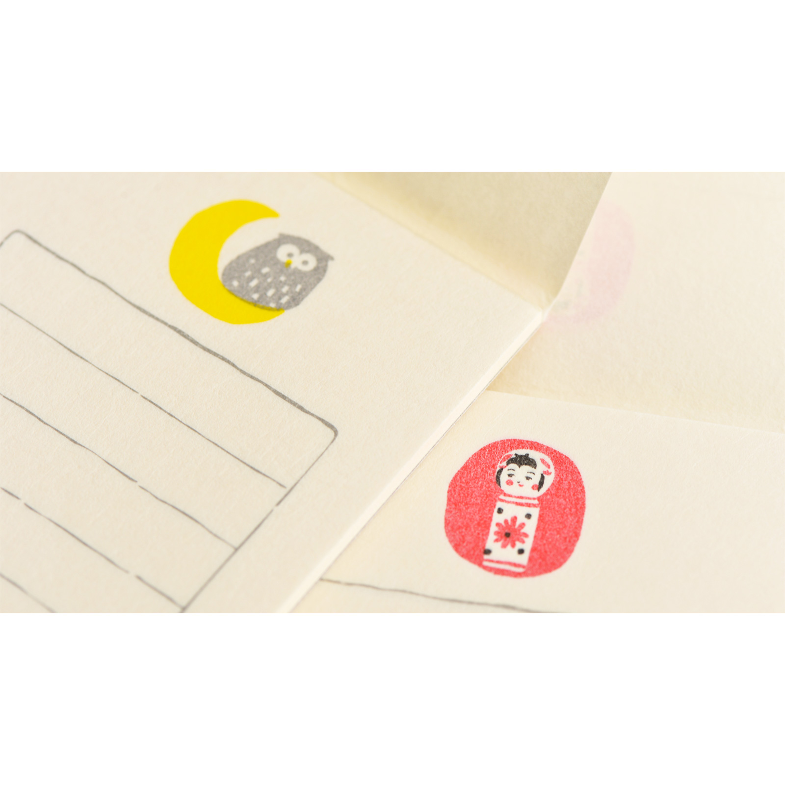 Kokeshi doll and owl illustrations adorn the space above the writing area.