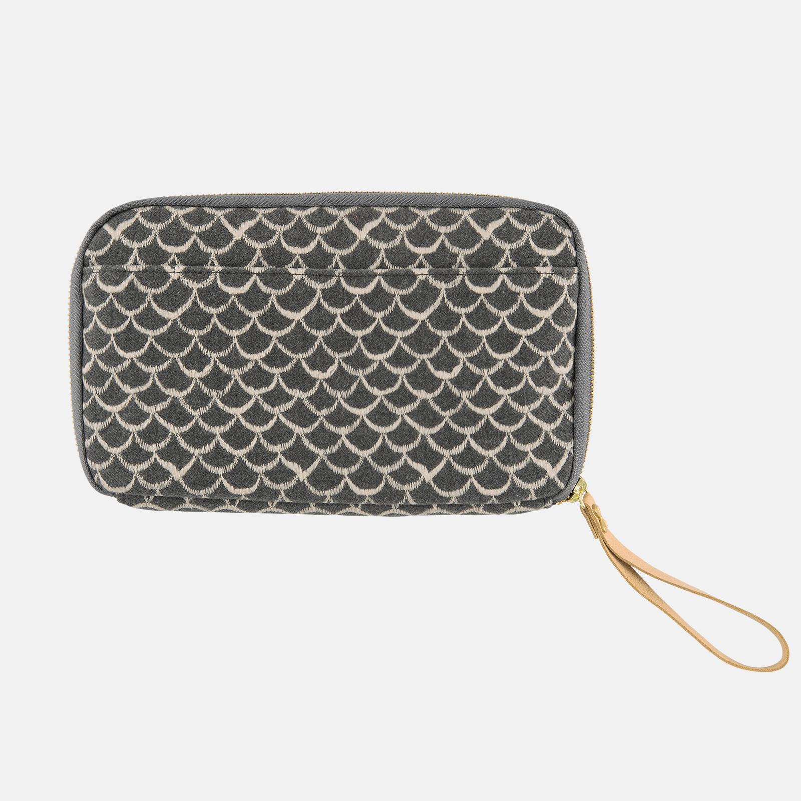 minä perhonen creates custom textiles that are specially dyed, embroidered and woven to recreate hand-drawn designs. This pouch is named after the textile it is made with, called “mermaid.” The pattern, resembling the small arc of fish scales, is carefully embroidered in waves across the material.