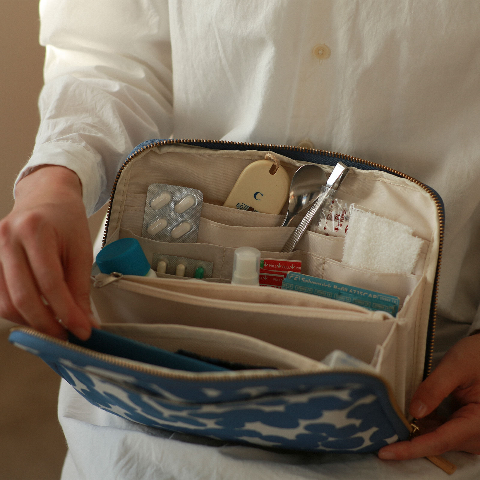 Keeping all your medicine and hygiene products in the pouch makes it a very reliable first aid kit for the home. We recommend also keeping prescription forms in one of the pockets. (Pictured: Soda Water)