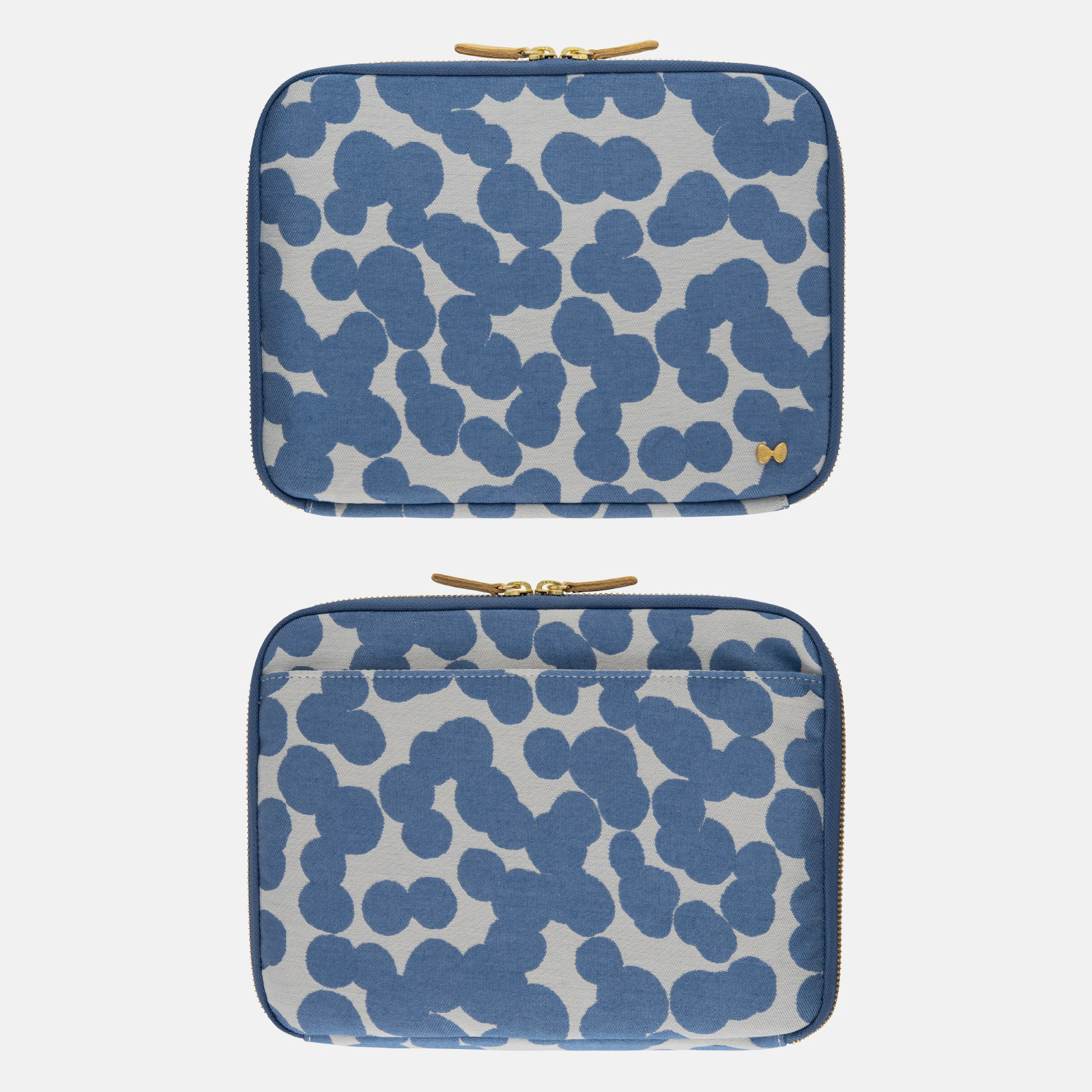 soda water is made from a Jacquard-weave fabric from minä perhonen, who creates all-original garment textiles. The light-gray background is dotted with woven blue circles, but look closely and you’ll see there’s more to this playful, experimental polka-dot design. The dots are not represented as solitary circles, but looking closely at the design, our eyes can see each dot individually. The bottom right of the pouch is adorned with a butterfly charm.