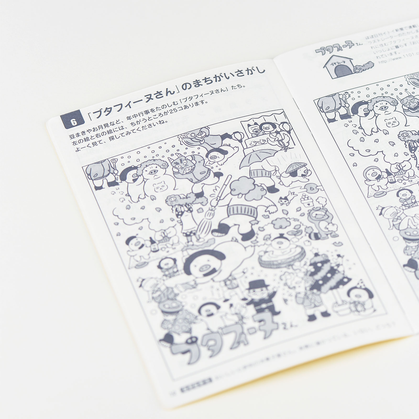 This booklet contains various mini pen-and-paper games to pass the time, such as Japanese crossword puzzles and spot the difference. Sudoku and mazes are provided by game book publisher Nikoli. Some of the spot the difference puzzles feature regulars in the Hobonichi website lineup, including Butafine and Sonigiri-kun. The puzzles are fun to play when killing time alone, or when spending quality time with family and friends.