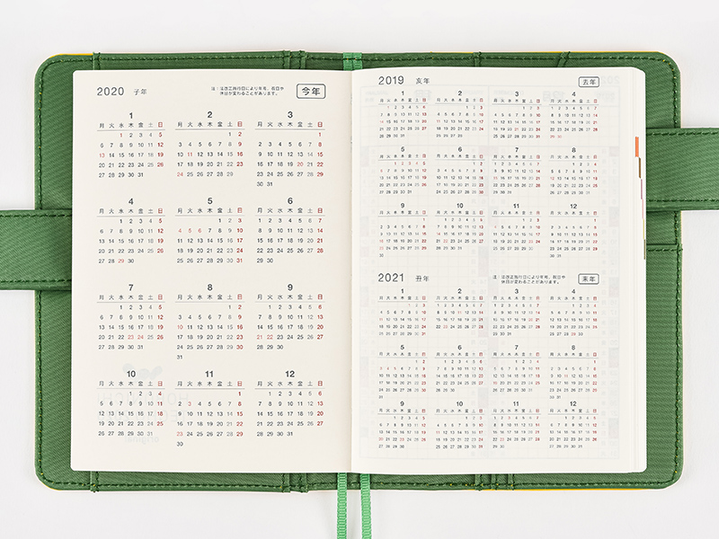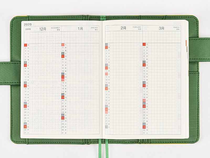 With 2 months per page, there are 8 pages covering the 16 months from December 2019 to March 2021. The top of each monthly column includes 4 lines of space for recording things like that month’s goals or commitments, or drawing in checkboxes for a to-do list.