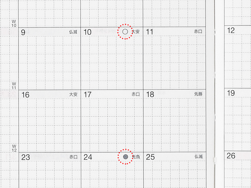 The calendars include icons depicting new moons (●) and full moons (○). (While the moon phase is the same across the world, the exact dates the moon phases land on are listed in Japan time.)