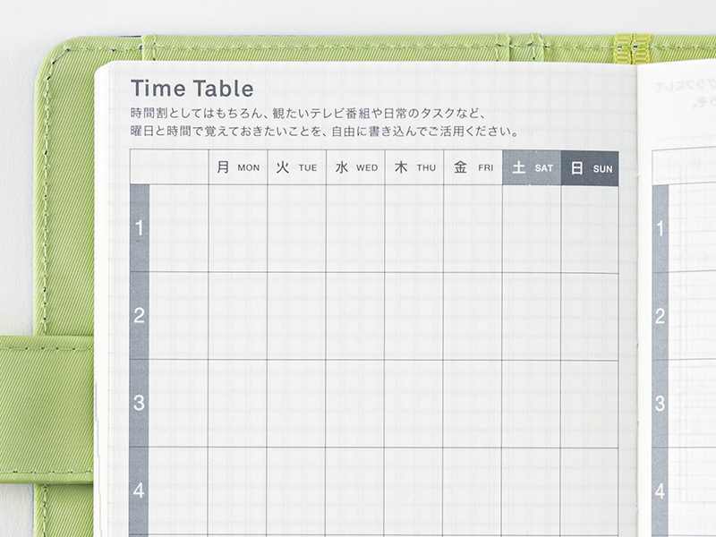 The book includes two timetables for writing in a recurring hourly schedule for each day of the week. These are useful, say, for filling in the broadcast times of favorite television shows, or splitting up house chores.