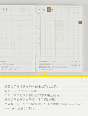After running surveys and holding round-table discussions with users, the graph paper size was finalized at 3.7 mm. Users of the Cousin, now in its second year, told us they missed the daily quotes, so we offered a separate book that collected all of them.