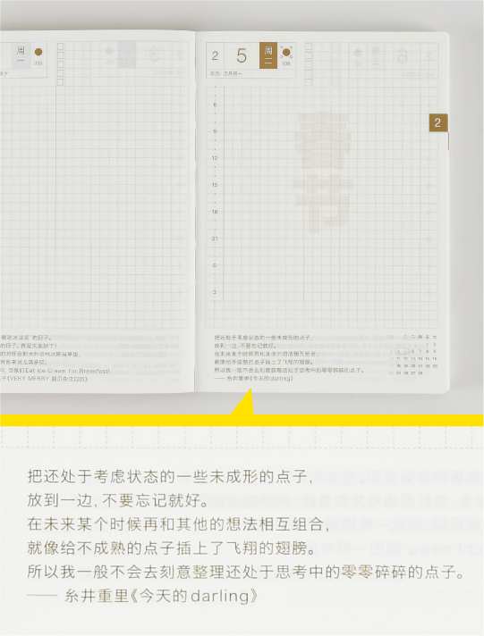After running surveys and holding round-table discussions with users, the graph paper size was finalized at 3.7 mm. Users of the Cousin, now in its second year, told us they missed the daily quotes, so we offered a separate book that collected all of them.