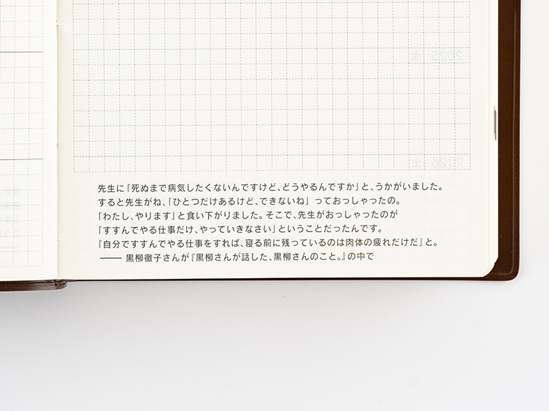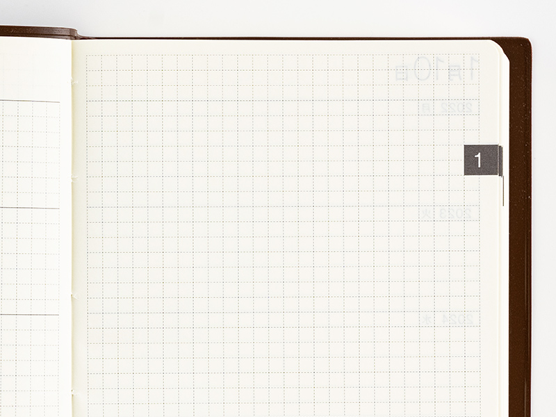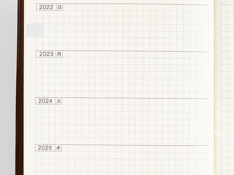 The basic format of the 5-Year Techo has the same date across five years listed on the left side, and a blank graph paper memo page on the right. The layout is flexible enough to allow users to either fill in their pages the same way every day or mix things up as they go.