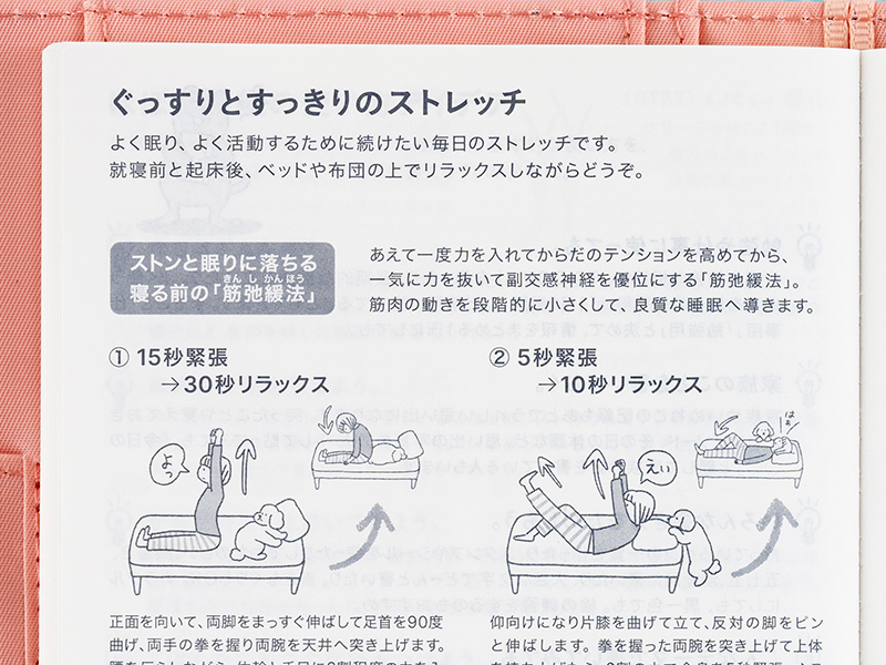 A set of daily stretches introduced by physical trainer Nakano James Shuichi paired with cute illustrations by Noriko Arai. These stretches are designed to help you relax on your bed before sleep and start the day refreshed after waking up.