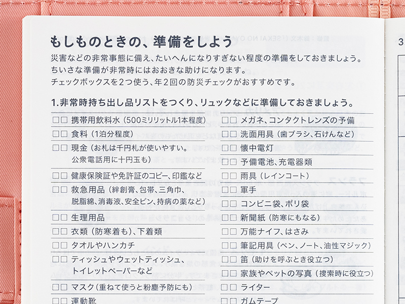 This page contains a checklist of items to have ready in case of an emergency. There is also a space to list nearby evacuation zones (common in Japan), emergency contact information and topics discussed between family and friends.